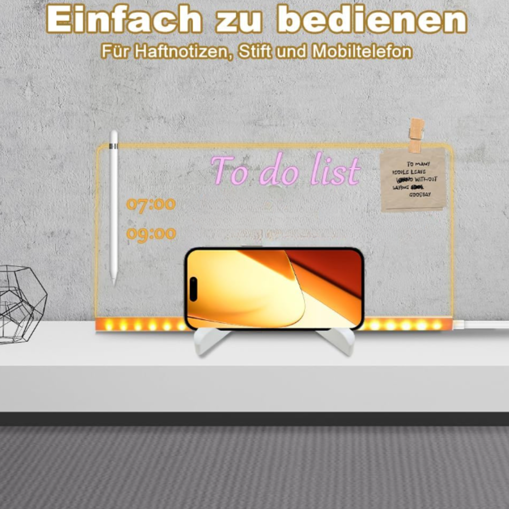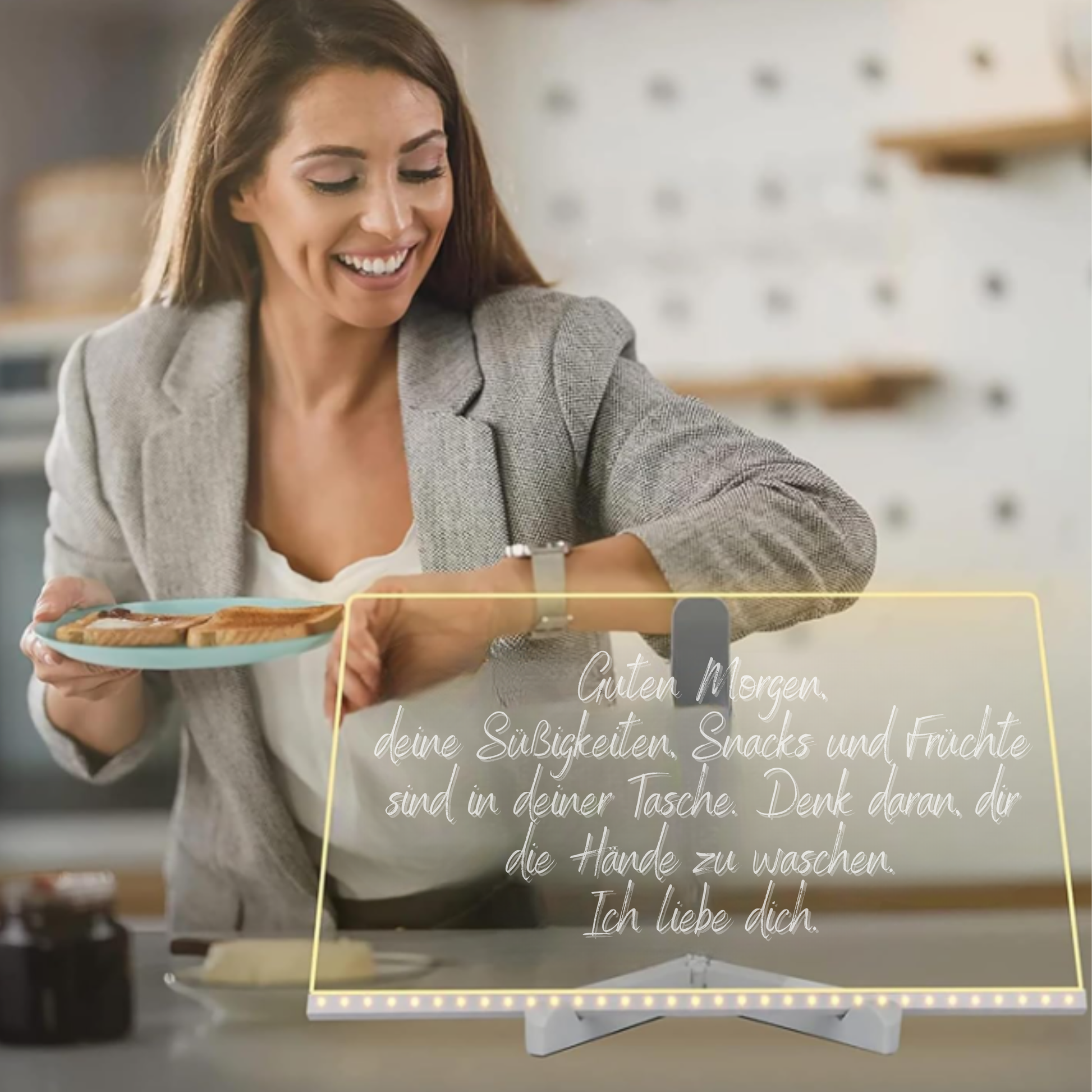 Durch das leichte Acryl-Design, den beleuchteten Ständer und die USB-Stromversorgung ist die Tafel sofort einsatzbereit und lässt sich überall flexibel verwenden. Ein Geschenk, das Kreativität, Organisation und liebevolle Momente auf leuchtende Weise verbindet.