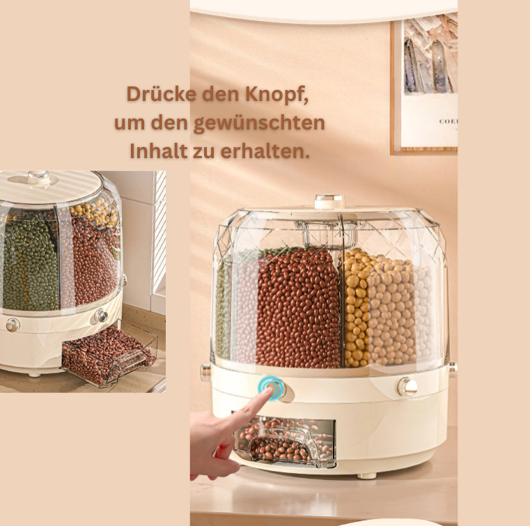 Einfach drehen, Portion wählen und Knopf drücken – schon fällt die gewünschte Menge direkt in die Schale. So bleibt alles frisch, trocken und perfekt organisiert. Dank des hochwertigen, modernen Designs passt der FreshTower in jede Küche und wird zum echten Blickfang auf der Arbeitsfläche.